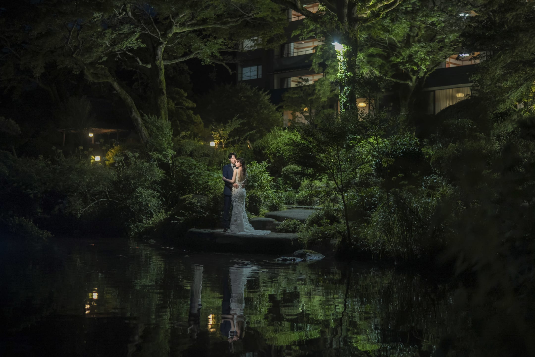 山月園以四季自然與日式庭園相融合。沉穩綠意與池水背景適合和裝與洋裝,能拍攝出優雅、靜謐的一張。
