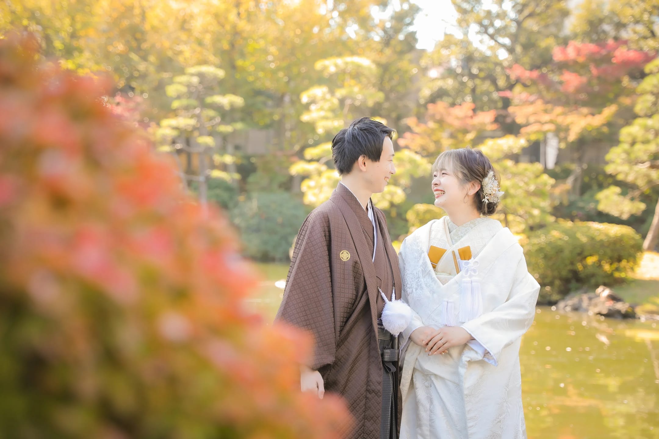 舊安田庭園是歷史悠久的池泉回遊式庭園,造景細緻優美。不僅適合和服,也能與禮服搭配出高雅經典的畫面。
