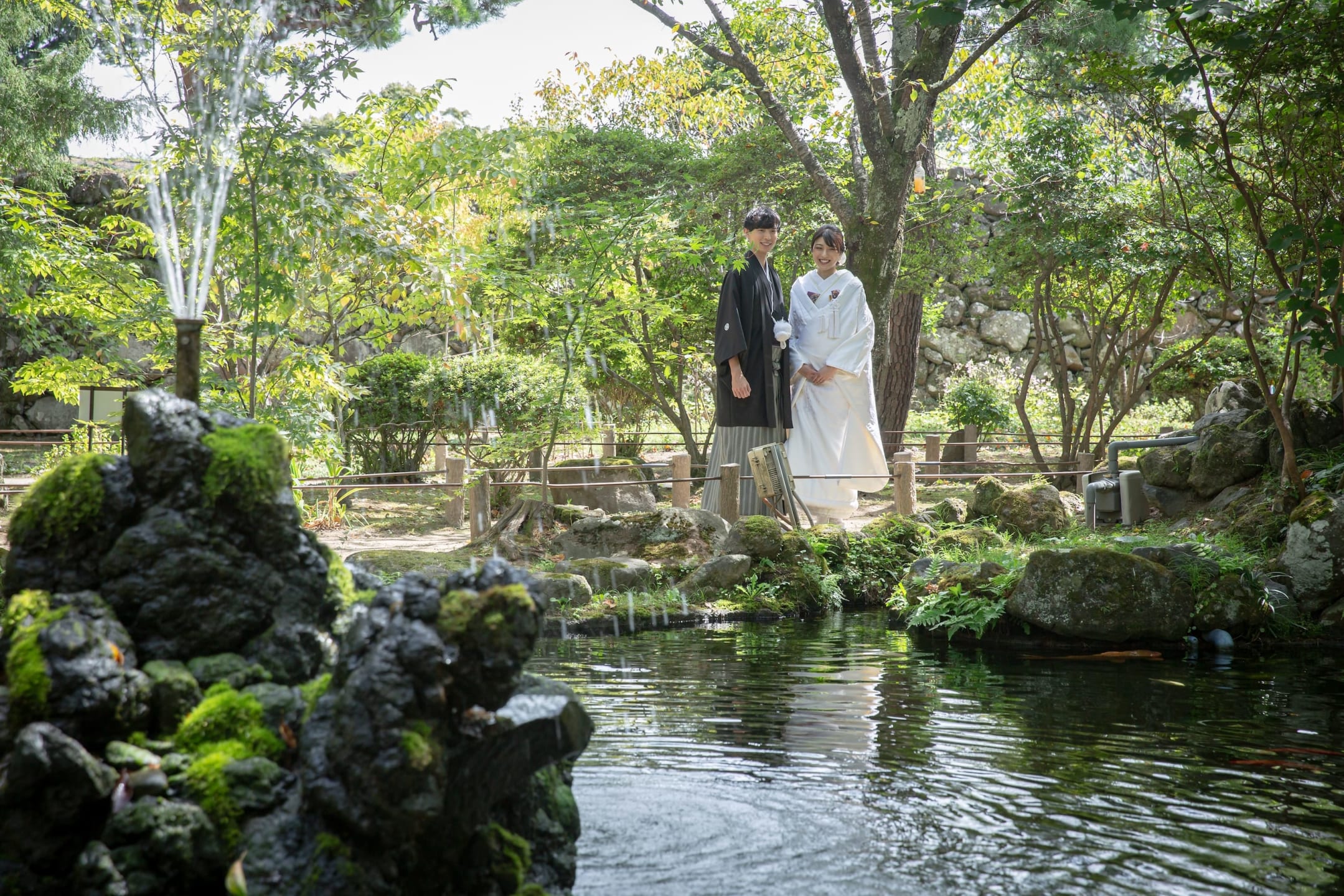輕井澤塔里亞森以湖畔景觀與豐富綠意為特色。以湖面倒影為背景的倒影攝影、在草地上展現開放感的取景,都能拍出運用自然光的自然且浪漫的婚紗預拍照片。