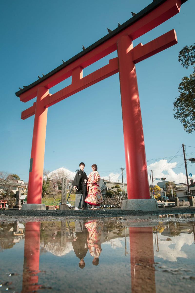 新倉山淺間神社以能眺望富士山的絕景而聞名。利用五重塔與山勢對比的構圖,能拍攝出和裝、洋裝皆具優雅與藝術感的預拍照片,與季節天空的變化亦相得益彰。
