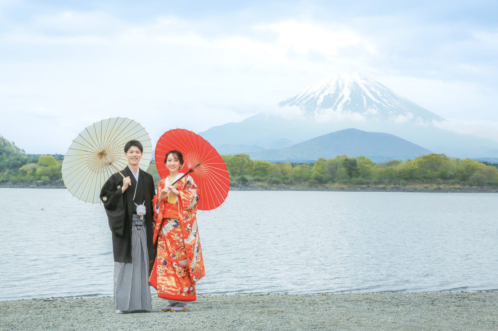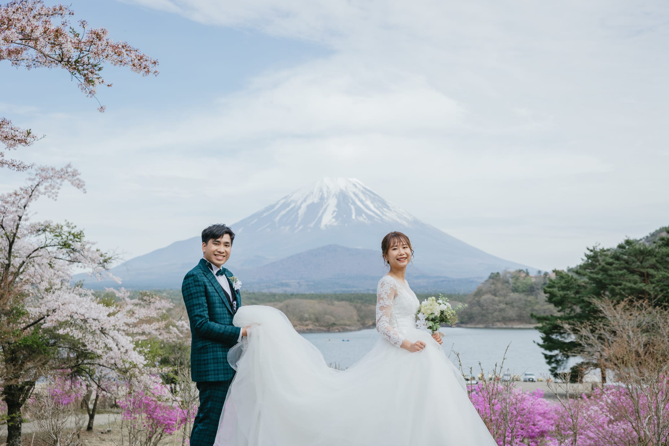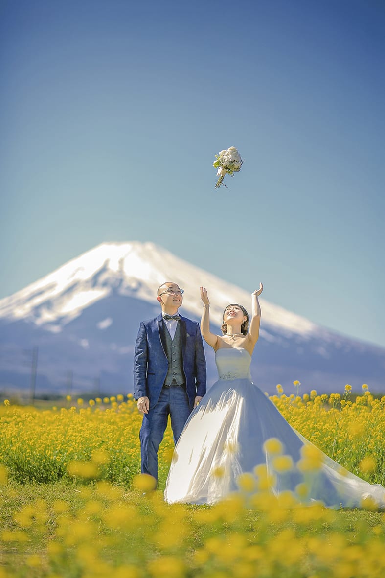 新倉山淺間神社以能眺望富士山的絕景而聞名。利用五重塔與山勢對比的構圖,能拍攝出和裝、洋裝皆具優雅與藝術感的預拍照片,與季節天空的變化亦相得益彰。