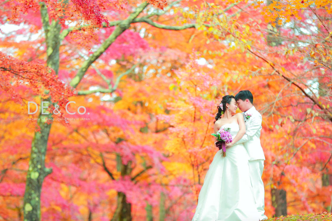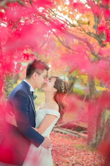 新倉山淺間神社以能眺望富士山的絕景而聞名。利用五重塔與山勢對比的構圖,能拍攝出和裝、洋裝皆具優雅與藝術感的預拍照片,與季節天空的變化亦相得益彰。