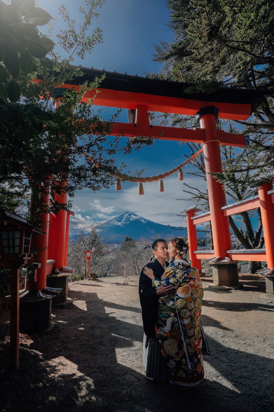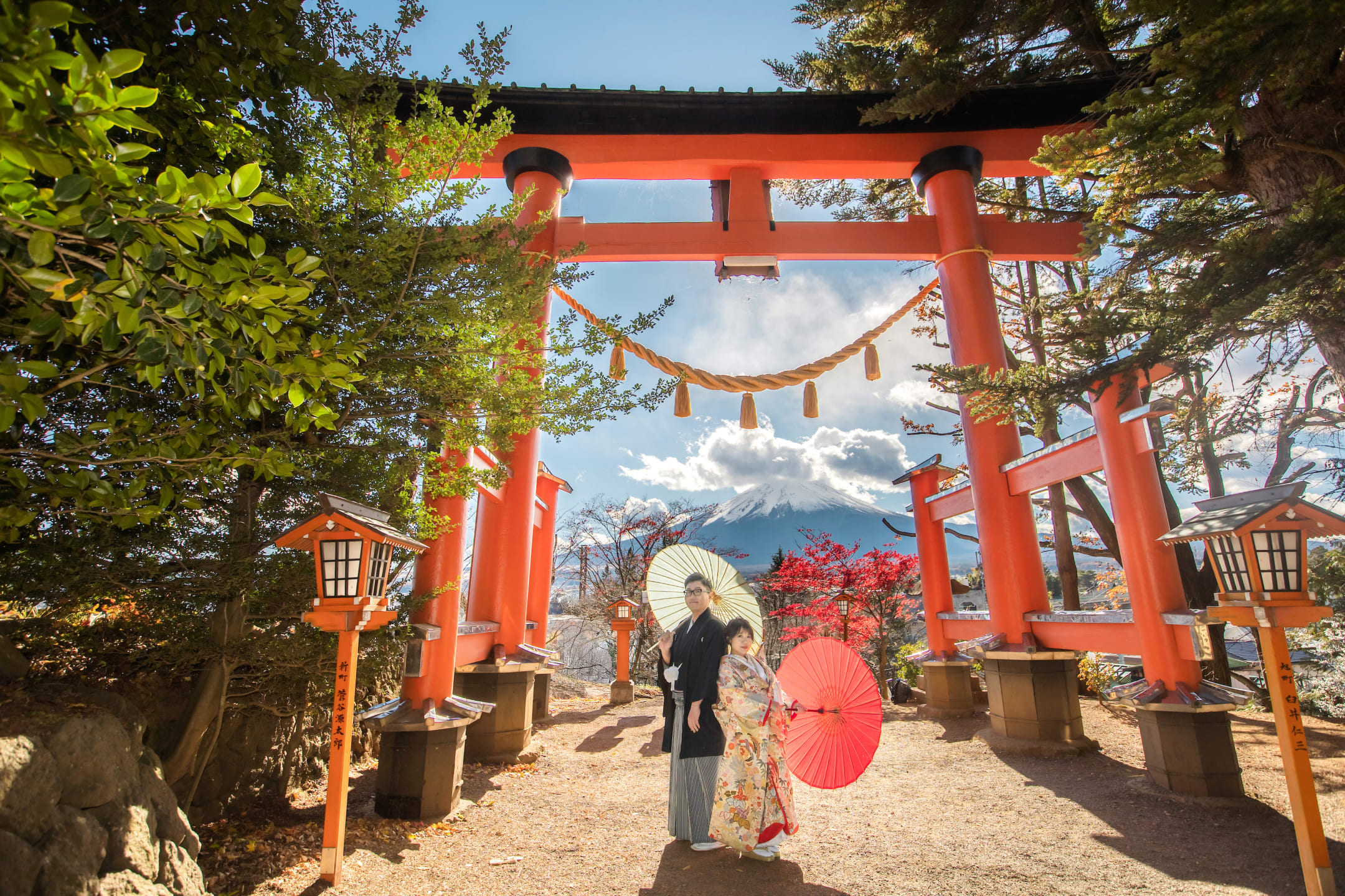 新倉山淺間神社以能眺望富士山的絕景而聞名。利用五重塔與山勢對比的構圖,能拍攝出和裝、洋裝皆具優雅與藝術感的預拍照片,與季節天空的變化亦相得益彰。