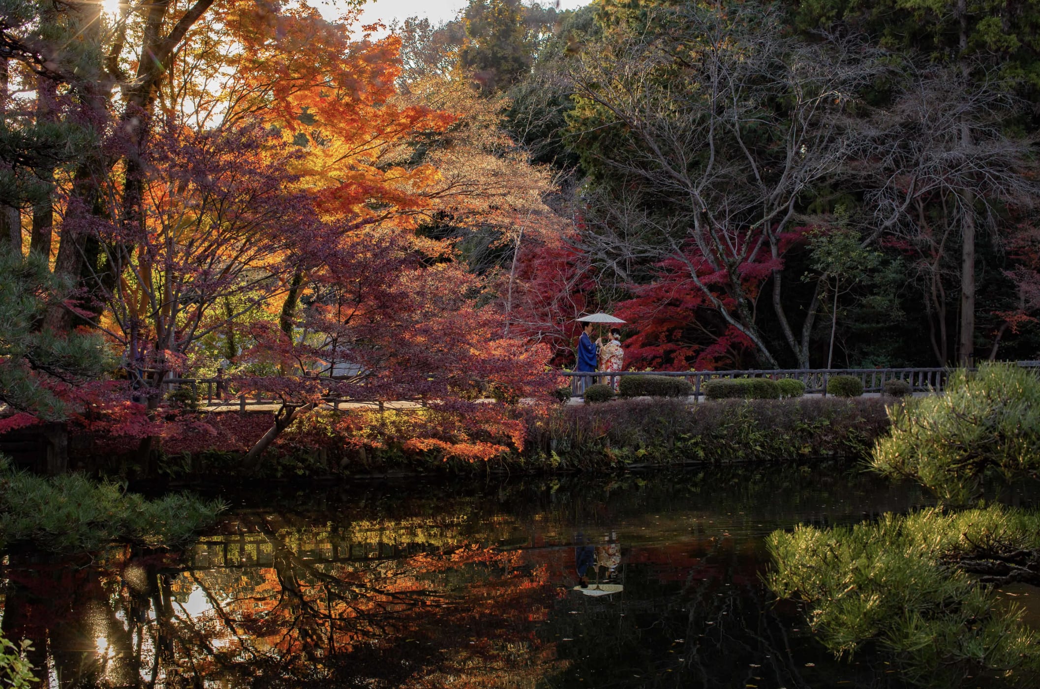 德川園是名古屋具代表性的高雅日式庭園,池泉、石橋與四季植栽交織出沉靜的景觀魅力。不僅適合和服,也能與禮服相得益彰,利用自然光拍攝出優雅的婚紗照片。