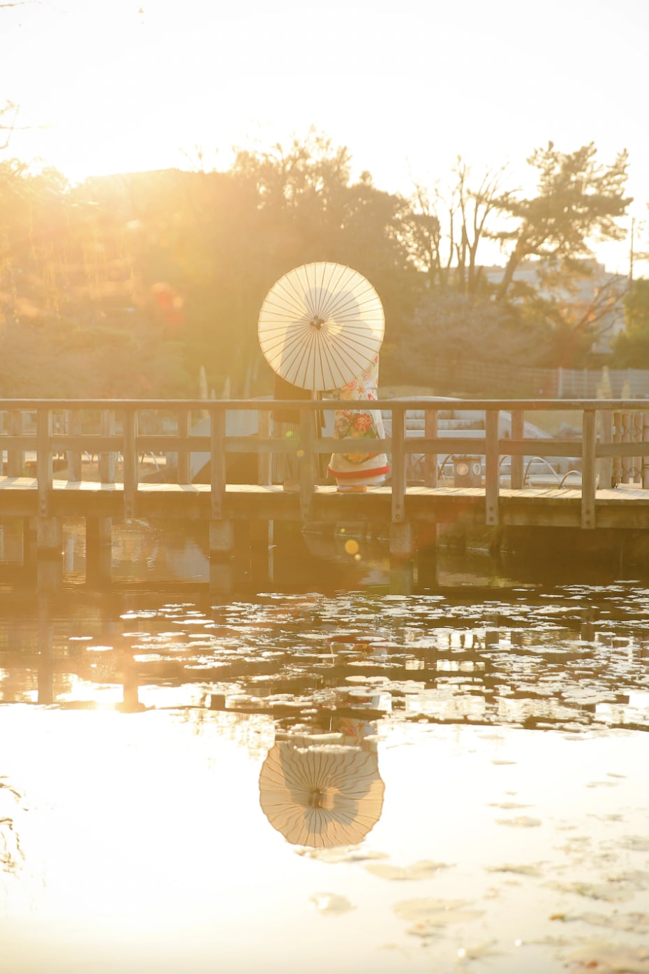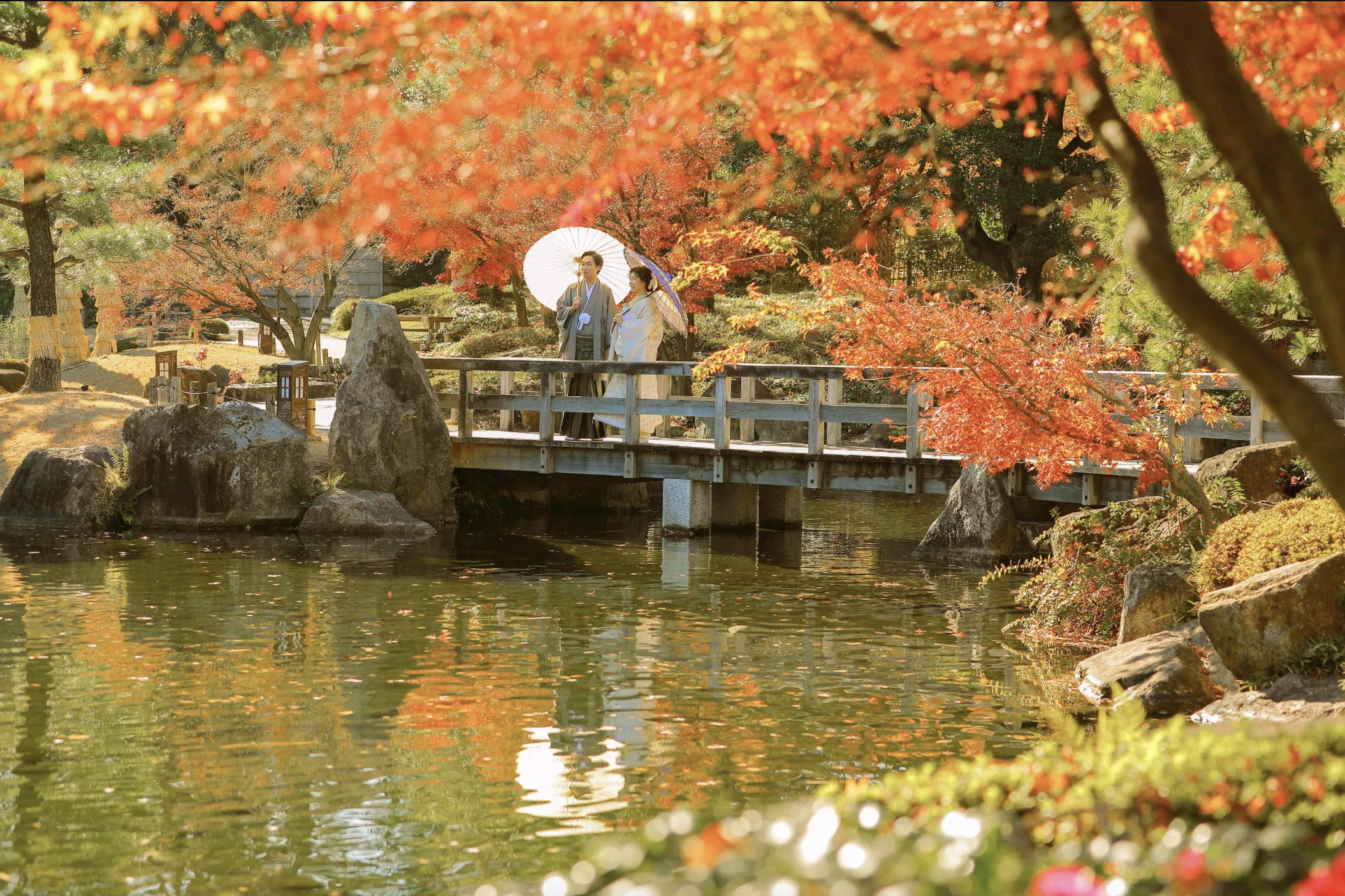 德川園是名古屋具代表性的高雅日式庭園,池泉、石橋與四季植栽交織出沉靜的景觀魅力。不僅適合和服,也能與禮服相得益彰,利用自然光拍攝出優雅的婚紗照片。