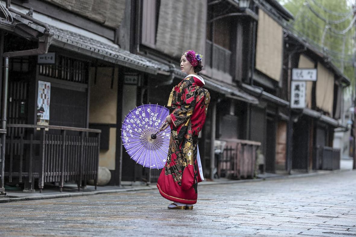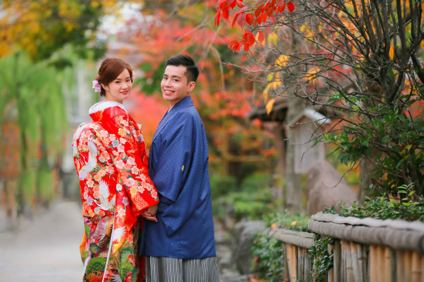 祗園擁有京都特有的石板小路與町家建築,充滿傳統風情。無論和服或洋裝,都能拍攝出展現古都情調的婚紗照。白川沿岸與巽橋周邊的景致四季皆美,是能捕捉優雅畫面的絕佳地點。